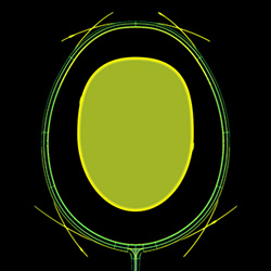 - Izometryczny kształt głowicy rakiety maksymalizuje obszar przecięcia się strun głównych i poprzecznych tworząc większy sweetspot (pole czystego trafienia)